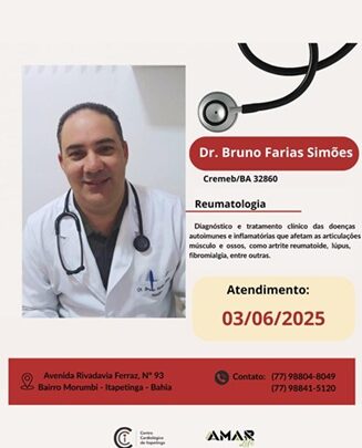 Na Villa AMAR, você conta agora com o atendimento do Dr. Bruno Farias Simões, médico especialista em reumatologia, pronto para cuidar de você com atenção e experiência. Ele atenderá no próximo dia 01/07, terça-feira.