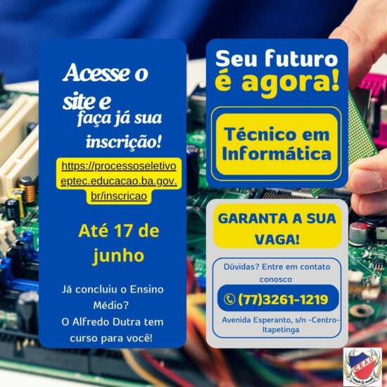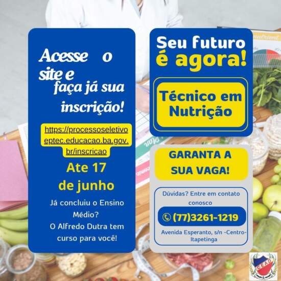 Para o Colégio Estadual de Tempo Integral Alfredo Dutra, em Itapetinga, estão disponíveis 70 vagas para os cursos de Nutrição e Dietética e Suporte em Informática (noturno). Para facilitar as inscrições, o CEAD montou um ponto de atendimento presencial na unidade escolar, que funcionará das 8h às 12h e das 14h às 20h nos dias 09 a 13 de junho.