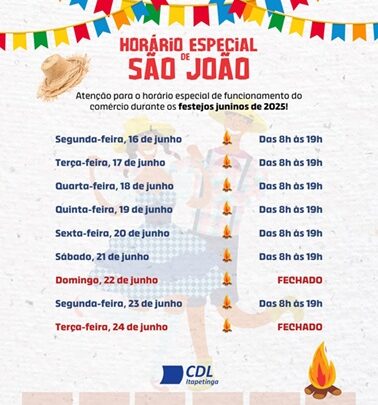 A Câmara de Dirigentes Lojistas (CDL) de Itapetinga, em parceria com o Sindicato dos Empregados do Comércio de Itapetinga e Itororó, definiu o horário especial do comércio para o São João 2025, período que deve registrar um aumento superior a 20% no volume de vendas em relação a 2024.