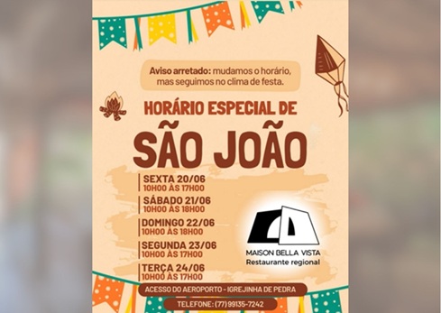 O clima junino já tomou conta do Maison Bella Vista, tradicional restaurante regional localizado na Igrejinha de Pedra, com acesso pelo aeroporto. Em um anúncio bem-humorado, o restaurante informou aos clientes sobre a mudança temporária no horário de funcionamento durante o período de São João.