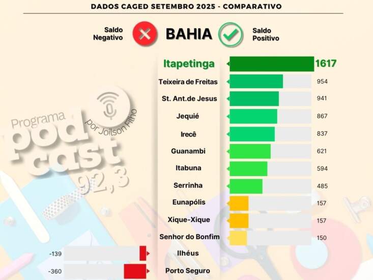 Com esse desempenho, a cidade se destaca como uma das que mais geram empregos na Bahia, superando centros tradicionais como Itabuna, Ilhéus, Porto Seguro, Jequié, Irecê e Serrinha.