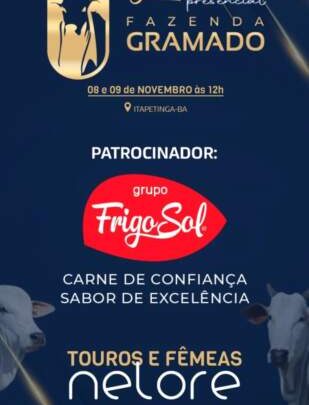 Itapetinga, no sudoeste baiano, será palco de um dos eventos mais aguardados do agronegócio da Bahia. Nos dias 08 e 09 de novembro, a partir do meio-dia, a Fazenda Gramado promove seu tradicional Leilão Presencial de Touros e Fêmeas Nelore, reunindo criadores, investidores e apaixonados pelo setor rural de toda a região.