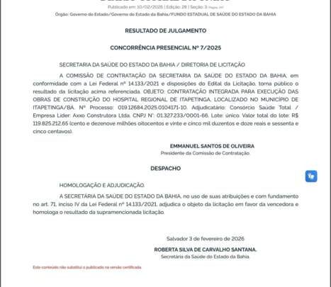 Itapetinga vive um momento decisivo para o fortalecimento da saúde pública e para o avanço estrutural do município. Foi homologado o resultado da licitação para a construção do Hospital Regional de Itapetinga, na Bahia, uma das obras mais aguardadas da região sudoeste. O processo, realizado na modalidade concorrência presencial, teve como vencedor o Consórcio Saúde Total, com empresa líder Axxo Construtora Ltda, e valor total de aproximadamente R$ 119,8 milhões.