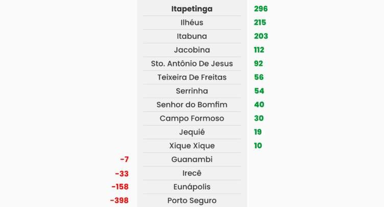 Entre as cidades superadas por Itapetinga no saldo de geração de empregos estão Ilhéus, Itabuna, Jacobina, Santo Antônio de Jesus, Teixeira de Freitas, Serrinha, Senhor do Bonfim, Campo Formoso, Jequié, Xique-Xique, Guanambi, Irecê, Eunápolis e Porto Seguro. Em alguns desses municípios, inclusive, o período registrou saldo negativo de contratações, reforçando ainda mais o desempenho positivo da economia itapetinguense.