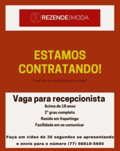 Boa notícia para quem está precisando de uma vaga de emprego, a Rezende Moda está contratando, não perca essa oportunidade de buscar sua colocação
